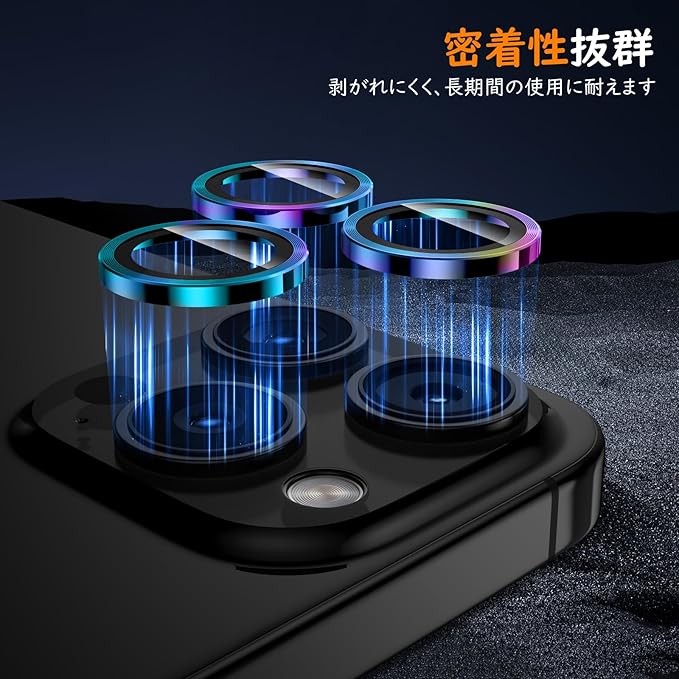 【4つ入り・予備があるので安心感UP!】iPhone 16 Pro/iPhone 16 Pro Max用カメラ保護カバーは、高品質なAB接着剤を使用しており、自動吸着と気泡防止機能を備えています。レンズに置くだけで、一発で完璧に貼り付けます。超強粘着力で、剥がれる心配もほとんどありません。更に、3枚セットで、張替の分も予備していますので安心感を大幅にアップ!