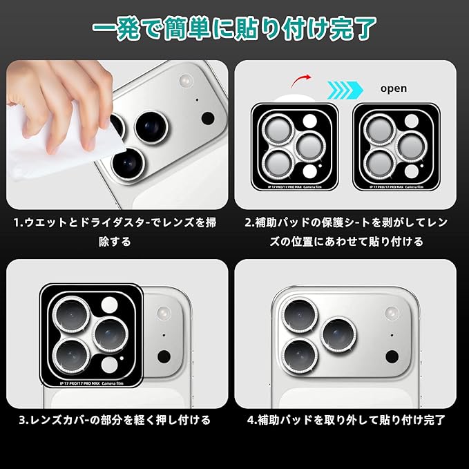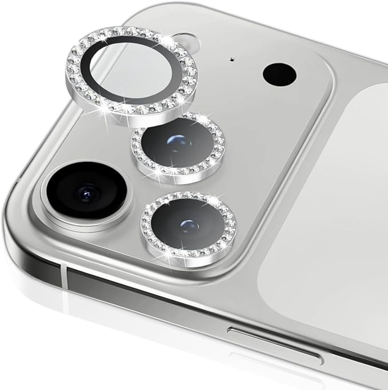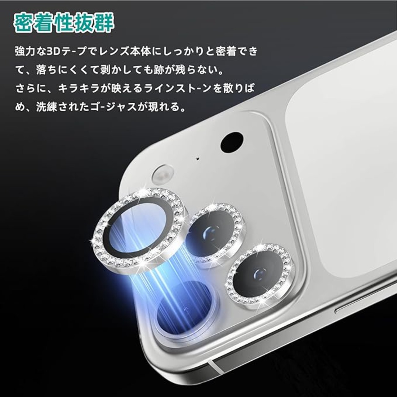 カメラフィルム iPhone 17 Pro/17 Pro Max対応 レンズフィルム アイフォン 17 プロ/17 プロ マックス 用 キラキラ ラインストーン付き レンズ カメラカバー レンズプロテクター アルミ合金 & 9H強化ガラス製 独立型 露出オーバー防止 高透過率 耐衝撃 キズ防止 カメラ保護フィルム iPhone 17 pro/17 pro max 用 シルバー