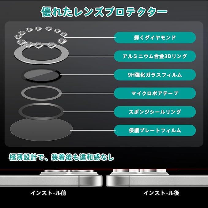 【優れた材質】 本製品は高品質のアルミ合金と9H強化ガラス製なので、レンズフィルム全体に優れた耐衝撃性を持たせ、落下時のカメラへの衝撃を緩和します。傷も付きにくくてナイフや鍵などの尖ったものからガラスをしっかり保護できます。そして、防塵、剝落防止、撥水撥油も実現できます。さらに、はめ込まれたラインストーンが太陽や光の下で、目を奪うような輝きを放ち、キラキラしていて非常に華やかで、洗練されていて、細部から一風変わったセンスが現れて独特なスタイルを実現します。