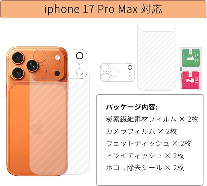 【対応機種】iPhone 17 pro max対応 炭素繊維素材フィルム【2枚】+カメラフィルム 【2枚】です。