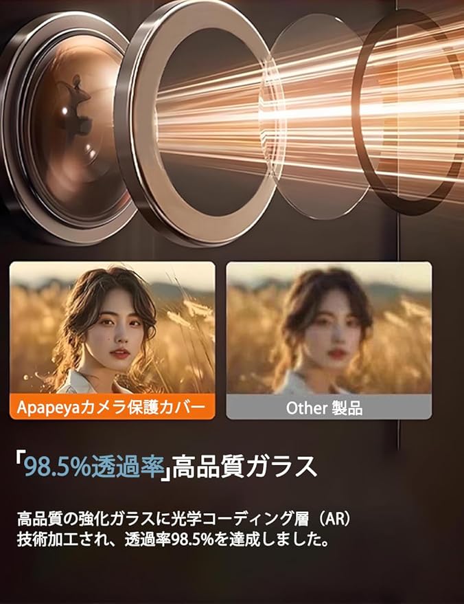 【透過率98.5%以上の高品質ガラス】:3眼レンズに高透過率ガラスを採用し、高品質の強化ガラスに光学コーディング層(AR)技術加工され、透過率98.5%以上を達成しました。宇宙航空アルミ合金材質と強化ガラス嵌め込み式一体型デザインは擦り傷や衝撃からカメラレンズをしっかりと守られます。