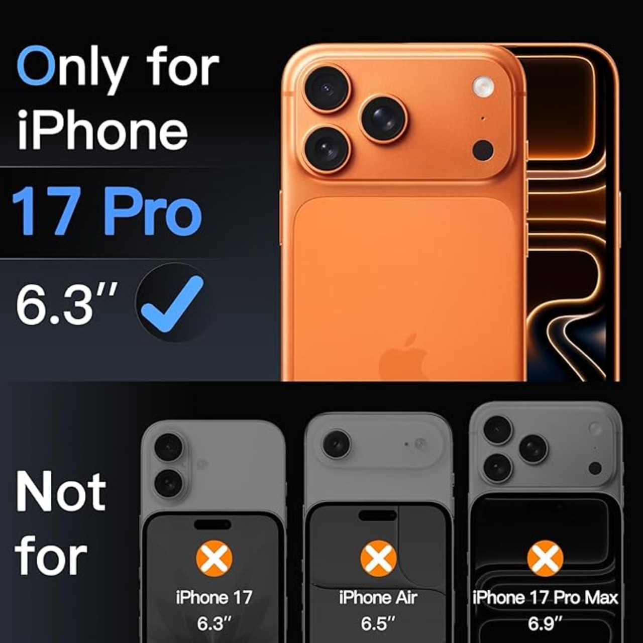 [ぴったりフィット] 1:1の精密なカッティングを採用し、iPhone 17 Pro 6.3インチに完璧にフィットします。注:iPhone 17 / Air / 17 Pro Maxには対応していません。十分なエッジスペースを残して、ほとんどの携帯ケースと互換性があります