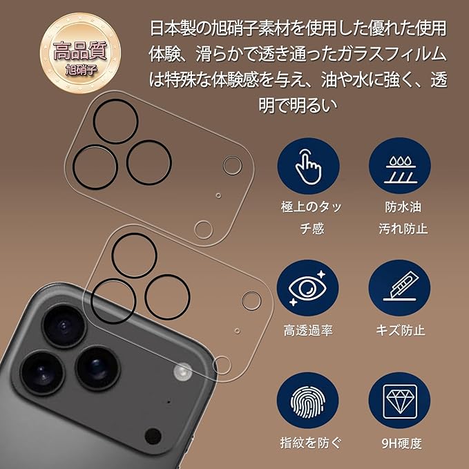 【極上の素材】 に適合する iphone 17 pro カメラフィルム 強化ガラス日本製素材で強い9Hの表面硬度を持っているため、、落としても割れません。工により万一割れてもガラス破片が飛び散りづらく、ナイフなどの鋭利なものを当てても傷がつきません。