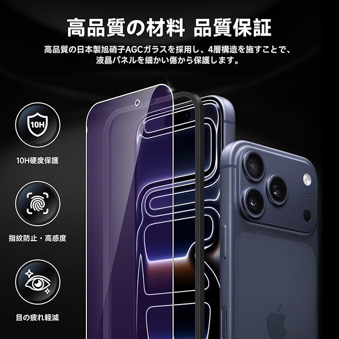 【硬度10H】 対応 iPhone 17 Pro 用の ガラスフイルム ブルーライトカット ガイド枠付き 【2枚セット- AGC旭硝子】 iPhone17pro フイルム 目の疲れ軽減 アイホン 17 プロ 液晶保護フィルム アイフォン 17 pro 強化ガラス 【 日本旭硝子素材採用 ラウンドエッジ加工 耐衝撃 飛散防止 超薄 厚さ0.26mm 気泡ゼロ 3D Touch対応 高感度 撥油性 指紋防止 超耐久 】 TZ10H-17PLG2
