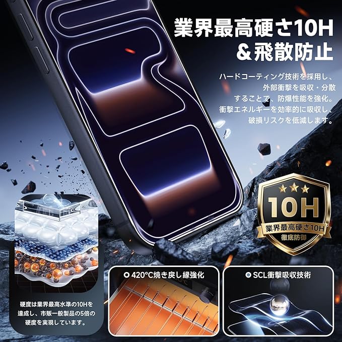 特徴 ①業界最高硬度10H、耐衝撃 ②目の疲れ軽減 ③スクラッチ防止、飛散防止④自動吸着、貼り付け簡単⑤気泡のない防止⑥撥水撥油、指紋防止⑦超高タッチ敏感度⑧超高透明感⑨ケースに干渉しにくいサイズ⑩超耐久