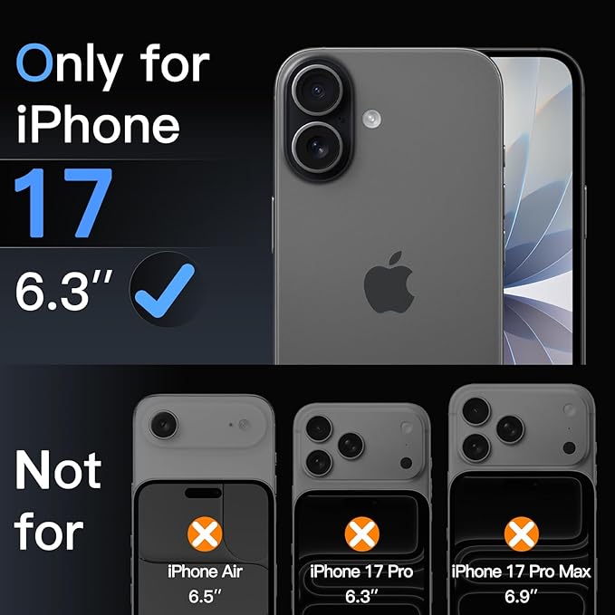 [ぴったりフィット] 1:1の精密なカッティングを採用し、iPhone 17 6.3インチに完璧にフィットします。注:iPhone Air / 17 Pro / 17 Pro Maxには対応していません。十分なエッジスペースを残して、ほとんどの携帯ケースと互換性があります