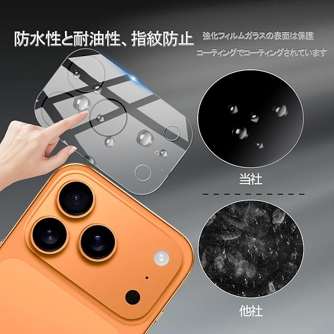 【指紋防止】いphone17pro カメラ保護 高耐久撥油コーティングが施され、汚れや油分をはじき、指紋がつきにくく、フィルムに汚れ、水滴、ほこりがある場合は、簡単に拭き取ることができます。