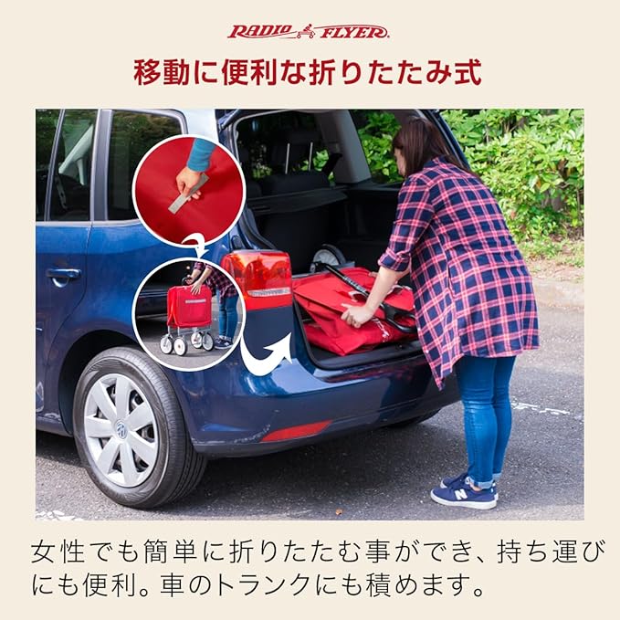 【乗り心地抜群!コンパクトに畳めベンチにもなる折りたたみ式ワゴン】 アメリカの家庭には一家に一台あると言われるラジオフライヤー。こちらはお子様を乗せたり荷物を快適に運べる大きなワゴンタイプ。ベンチとしても使えるのでおでかけ時の休憩タイムにも活躍します。