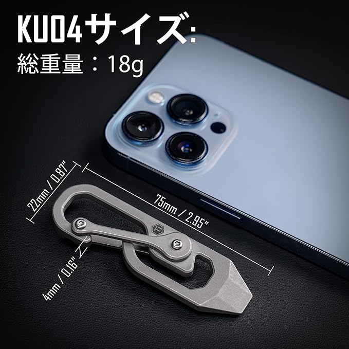 【チタンマルチツール】チタン合金からCNC加工され、腐食や錆びがなく、さらに、優れたサンドブラストとストーンウォッシュ加工により、この機能的なカラビナはユニークで優れた製品に仕上がっています。KU04全長75mm、幅22mm、厚さ4mmで、手に持ちやすいサイズです