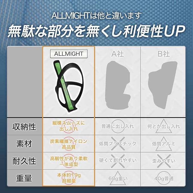 【サイクリングライフを快適に】ALLMIGHTのボトルケージを利用することで水分補給をスムーズに行えるため疲れにくくなり、自転車、ロードバイクでのロングライドや競技でのパフォーマンス向上に繋がることが期待できます。