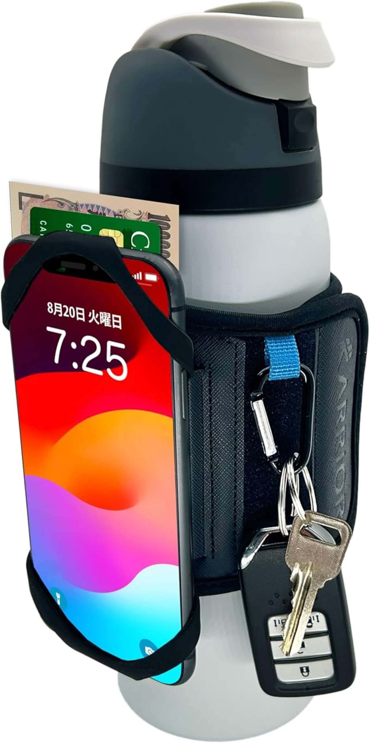 【対応ボトル・スマホ】◾️直径6.5cm~9cmのボトルに対応 ◾️スマホは 4.5インチ〜 7インチまで対応。※ボトルの側面の形状が並行でないものは使用できない場合があります。また、ポーチの高さが11cmのため、ハンドル(取っ手)付きのボトルには対応できない場合があります。ご購入の前にお手持ちのボトルのサイズをご確認ください。スマホケースを装着したままでもご利用いただけますが、上記対応サイズ範囲内である必要があります。