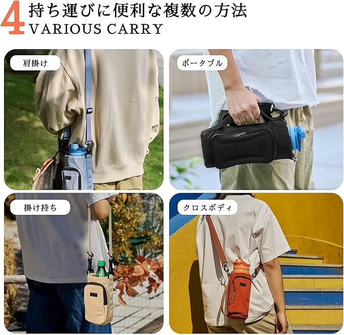 4WAY持ち方で使い分け自在:肩掛け、ポータブル(手持ち)、掛け持ち(バッグなどに引っかける)、クロスボディの4通りの使い方が可能。シーンに合わせて自由にスタイルを変えられ、便利でおしゃれです。学生の通学や大人の通勤、登山やスポーツにも最適です。
