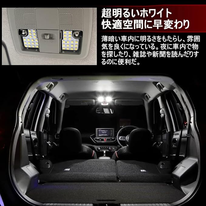 <超明るいホワイト 車内の雰囲気が一変>車用ルームライトには高輝度5050SMD3チップを搭載し、1チップSMDの3倍の明るさが実現しています。薄暗い車内に明るさをもたらし、雰囲気を良くになっています。純正色とは違い、まるで屋内にいるような温かい光を発行します。夜に車内で物を探したり、雑誌や新聞を読んだりするのに便利です。車中泊にとって、超明るい車内灯がおすすめです。