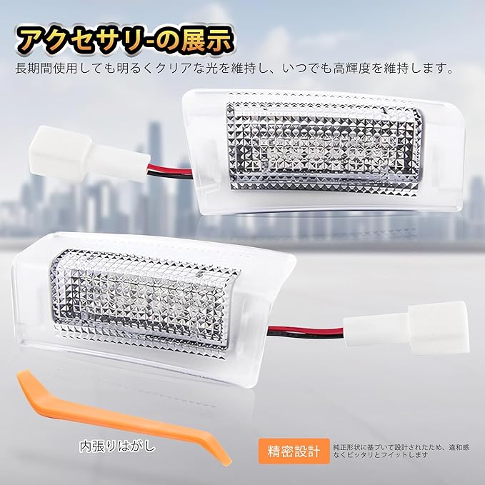 【対応車種】新型アルファード40系(AAHH4#W/AGH4#W、R5.6以降)、新型ヴェルファイア40系(AAHH4#W/TAHA4#W、R5.6以降)専用設計。セット内容:カーテシランプ 2、内張りはがし工具 1。 【純正LEDを凌駕する圧倒的な明るさ!】純正LEDカーテシランプの物足りなさを解消!本製品は18個の高輝度LEDチップを搭載し、広範囲を均一に照らす純白色の光を実現。ドア開閉時の足元照明として、安全性と高級感を同時に向上させます。 【車種専用3D設計でピタリフィット】3Dスキャナーで取得した車両データをもとに、純正品と同等の精密フィッティングを追求。後付け感ゼロのシームレスな取り付けで、車内インテリアに自然に溶け込みます。 【カプラーONで簡単交換】配線加工不要のプラグ&プレイ設計。純正LEDを取り外し、本製品に差し替えるだけのワンタッチ取り付け。配線を傷つける心配もなく、元に戻すことも可能です。 【高級感あふれる照明空間を】明るく澄んだ光が車内を優しく包み込み、夜間の乗降時も安心。上質な光で愛車の雰囲気を格上げし、毎日のドライブをより特別な時間に変えます。
