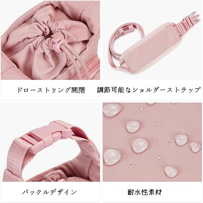 【簡単な巾着】: 巾着留めのデザインにより、ウォーターボトルをしっかりと設置でき、キャリーストラップが付いているので、大人にも子供にも理想的な選択肢です。