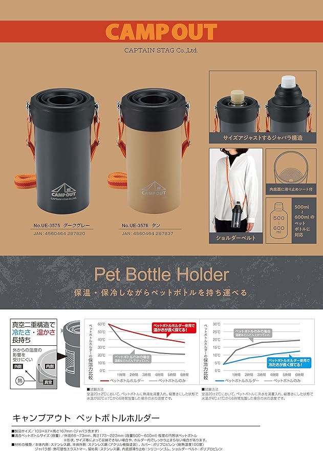 キャプテンスタッグ(CAPTAIN STAG) ペットボトルホルダー ペットボトルクーラー HD ステンレスペットボトルホルダー 真空断熱 保温 保冷 500ml 600ml 兼用 ショルダーベルト付 ダークグレー キャンプアウト UE-3575