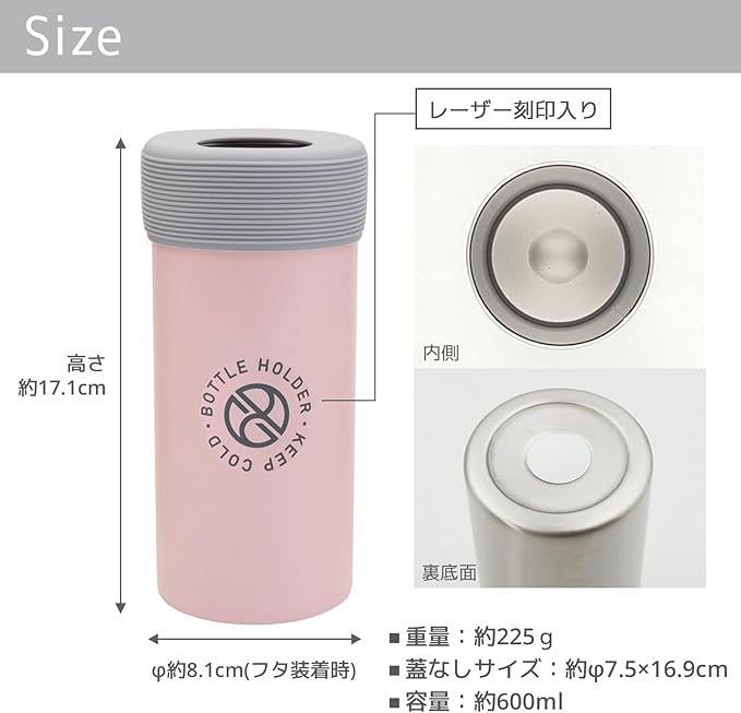 ■商品サイズ(フタ装着時):約φ8.1 h17.1cm/重量約225g (ホルダー本体のみ):約φ7.5 h16.9cm/容量約600ml(満水) ■ ■生産国:生地=中国、絵付加工=日本 ●真空断熱二重構造で冷たさ長持ち! ●結露しないからカバンの中やデスクでも安心して使えます。 ●耐久性・耐錆性に優れた18-8ステンレス素材を使用。 ●本体直径約7.5cmのスリムボディで女性でも持ちやすく、車のドリンクホルダーにも入ります。 ※ホルダーの形状によっては対応していない車種もあります。 ●滑り止め加工が施されたシリコーン蓋でキャップの開閉時にペットボトル本体が回転しにくくなっています。 ●シリコン蓋の着け外しが簡単にできます。 ●500~600mlのペットボトルに対応しています。 ●シリコン蓋を外せば直飲みタンブラーとしてハイボールやカクテル、ビールなどにもお使いいただけます。 ●アウトドア、スポーツ、オフィス、ドライブ、家呑みなど様々なシーンで活躍してくれます。