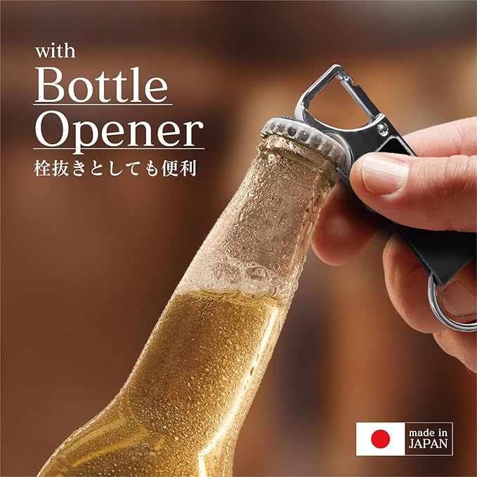 【ボトルオープナー(栓抜き)機能付き】 シンプルなデザインに「栓抜き」の機能を落とし込んだ本製品は、実際に栓抜きとしての使用も可能。瓶ビールや瓶タイプの飲料を楽しむシーンで、栓抜きが身近にない時にも役立ちます。 キーリングとしての日常的な使用は勿論、キャンプ、ハイキング、サイクリングなどの様々な場面で持ち歩くことで、「あったら便利」を体感してください。 (*栓抜きとして使用する際は、しっかりと栓のフチにフックを掛けてご使用ください。掛かりが浅い/手が濡れている時などは、本製品が滑ることで思わぬ怪我につながる危険性が有りますので、十分にお気を付けください)