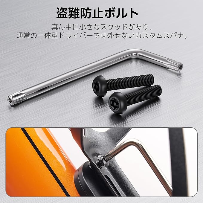 盗難防止 ネジの真ん中に小さなスタッドがあり、一般的なトルクスドライバーでは外せないため、カスタムレンチが必要です。付属のセキュリティースクリューは、ほとんどのボトルケージに対応できる長さです。(トルクス六角レンチ付属。なくさないように!)