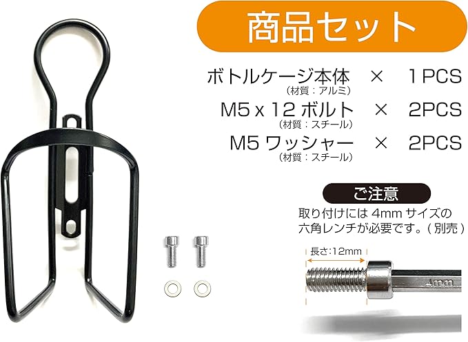 付属品:ボトルケージ本体 x 1PCS / M5x12ボルト x 2PCS M5ワッシャー x 2PCS ※取付には4mm六角レンチが必要です。(別売)