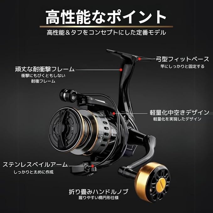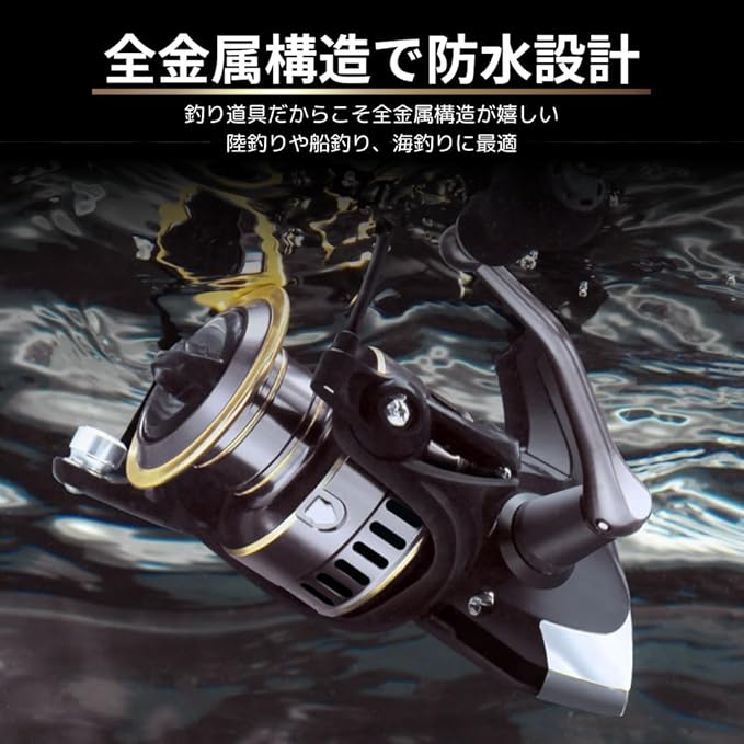 高強度CNC加工されたアルミ合金製のハンドルとスプール、そしてステンレスベイルアームやクロムメッキのラインローラーを採用したこのスピニングリールは、耐久性に優れた一体成型ボディを誇ります。全金属構造で防水機能も備えており、陸釣りや船釣り、海釣りに最適です。軽量で操作しやすいハンドルノブが付いており、ツインパワーやルビアスに匹敵するパフォーマンスを発揮します。