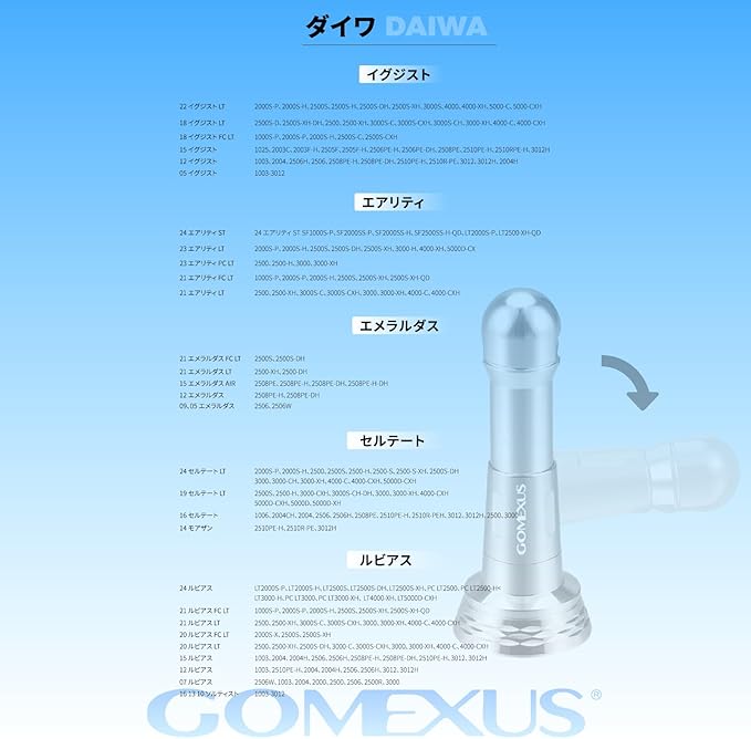 【対応機種】シマノ、ダイワリールの一部。お手持ちのリールと対応表をご確認頂き、お好みのカラーをお選び下さい。機種について、お分からない場合は是非お問い合わせください。★ご注意:1000‐2000の機種の装着部が短くて、脱落する恐れがありますので、おすすめいたしません。