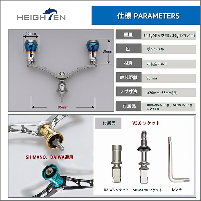 HEIGHTEN V2.0 95mm リール ハンドル 20mm ハンドルノブ 搭載 シマノ ダイワ 通用 スピニングリール用 Aurora Series