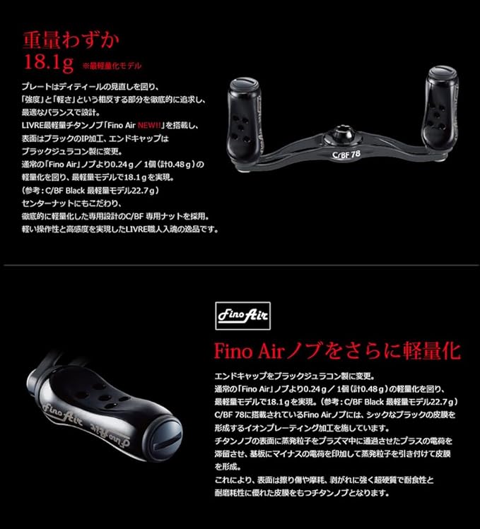 リブレベイトフィネスカスタムハンドル C/BF 78mm◆重量18.1g★プレートはディティールの見直しを図り、『強度』と『軽さ』という相反する部分を徹底的に追及し、最適なバランスで設計。LIVREs最軽量チタンノブ『Fino Air NEW‼』を搭載し、表面はブラックのIP加工、エンドキャップはブラックジュラコン製に変更。通常の『Fino Air』ノブより0.24g/1個(計0.48g)の軽量化を図り、再計量モデルで18.1gを実現。センターナットにもこだわり、徹底的に再軽量化した専用設計のC/BF専用ナットを採用。軽い操作性と高感度を実現したLIVRE職人入魂の逸品です。