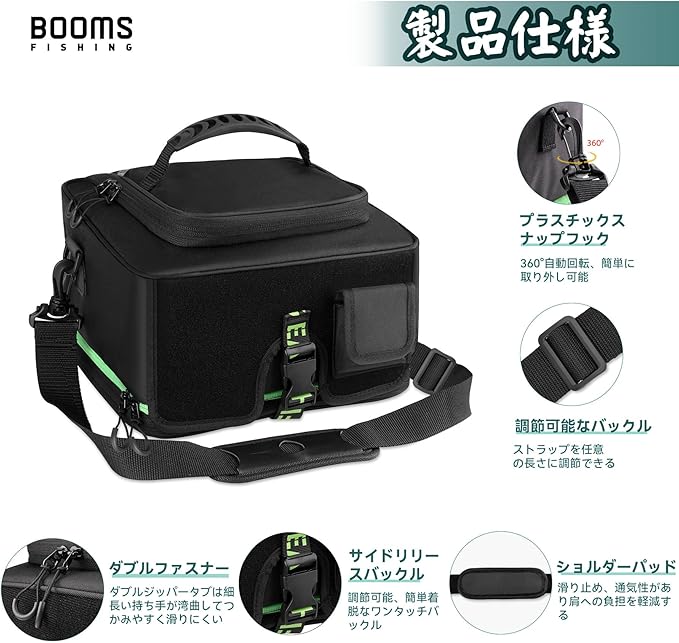 釣り用パックの重さ:950g、拡張前サイズ:28x25x18.5cm、拡張後サイズ:28x25x32.5cm、ショルダーベルトの長さは約50~135cmまで調節できます。