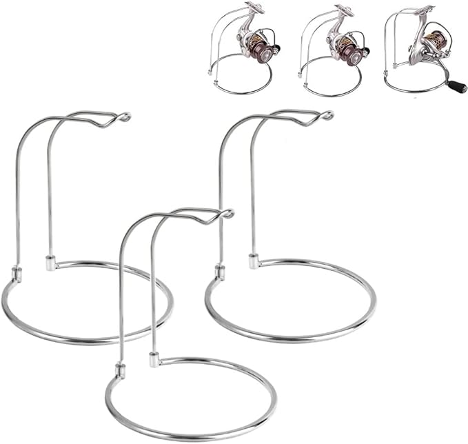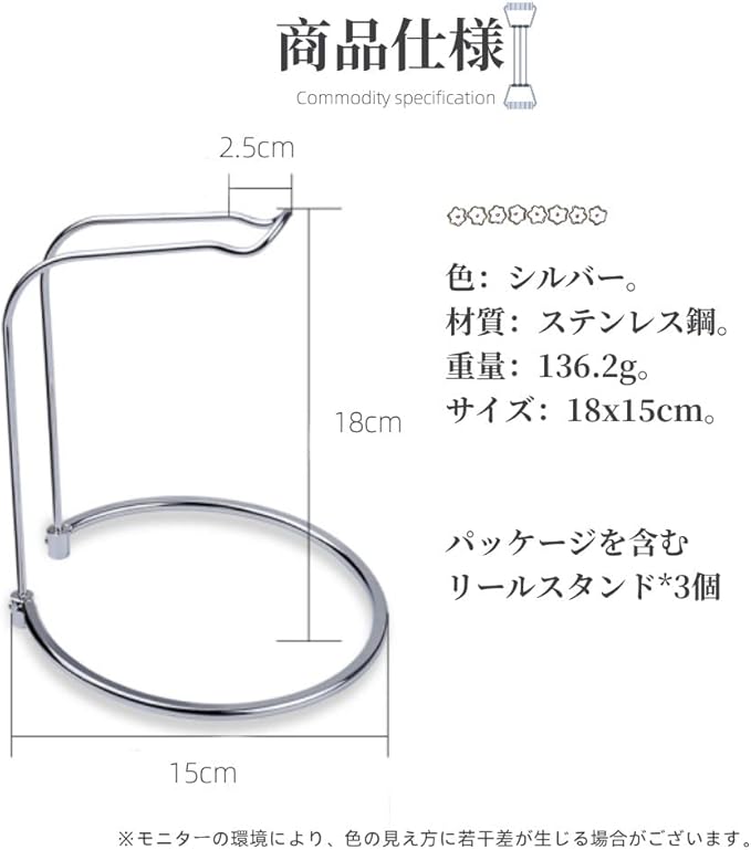 【仕様】材質:ステンレス鋼。サイズ:土台直径:約15cm、高さ:約18cm、フック部分:約2.5cm。パッケージ内容:リールスタンド*3個。付属品:リールスタンド用パーツ、六角レンチ。錆に強いステンレス製、リールが映えるスタイリッシュなデザイン。