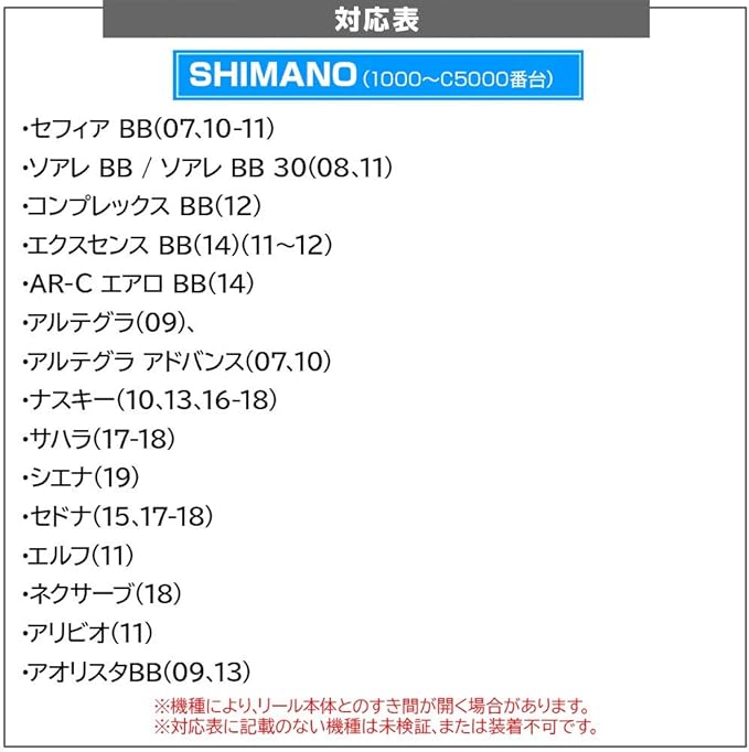 対応機種:SHIMANO(1000~C5000番台)・セフィア BB(07、10-11) ・ソアレ BB / ソアレ BB 30(08、11) ・コンプレックス BB(12) ・エクスセンス BB(14)(11~12) ・AR-C エアロ BB(14) ・アルテグラ(09)、 ・アルテグラ アドバンス(07、10) ・ナスキー(10、13、16-18) ・サハラ(17-18) ・シエナ(19) ・セドナ(15、17-18) ・エルフ(11) ・ネクサーブ(18) ・アリビオ(11) ・アオリスタBB(09、13)