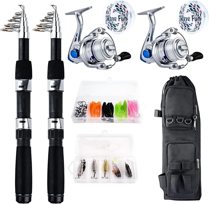 2本の釣りセット: 2.1m 伸縮式釣り竿 2 本(家族・友人と同時に楽しめる)、事前にラインを巻き込んだスピニングリール 2 本(開封即使用)、予備ライン 2 本(切れた際の緊急対応用)、ルアー(リアルデザインで魚誘引率 UP)・フック付き仕掛け箱 2 個、ドローストリングキャリーバッグ 1 個。初心者も手順を覚えるだけですぐに釣りを開始でき、経験者も旅行・ハイキング時の「予備竿セット」として最適です