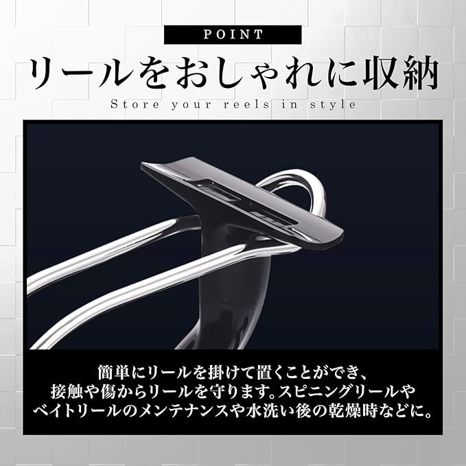 【シンプルなデザイン】シンプルなデザインのため、リールを飾るインテリアスタンドとしても活用できます。収納・保管だけでなく、店舗でも展示用としてご利用いただけます。大切なリールをかっこよく見せてくれる優れた機能性を持っています。