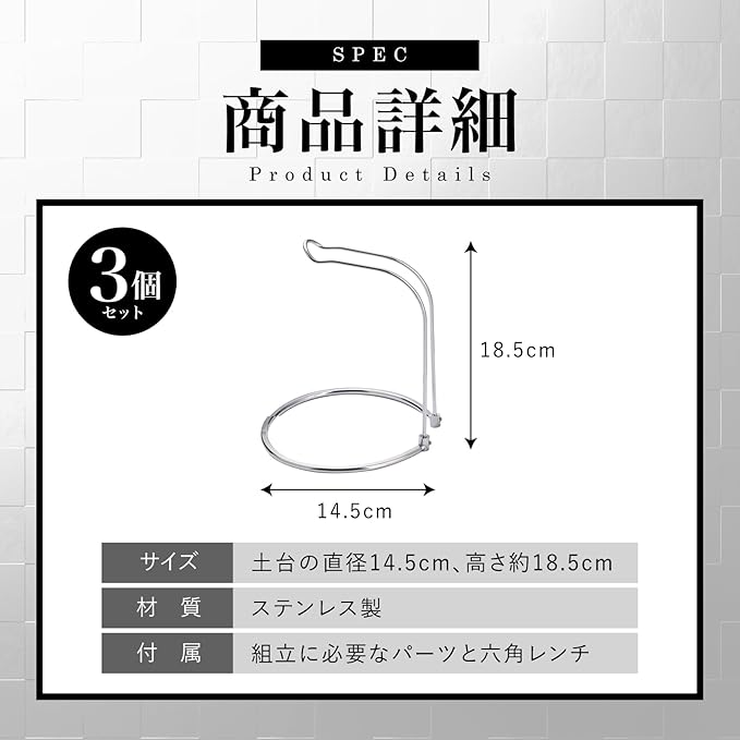 【サイズ・仕様】素材はステンレス製で、サイズは土台の直径14.5cm、高さ約18.5cmです。リールスタンド3個セットには、組立に必要なパーツと六角レンチが付属しています。錆に強い設計で、リールが映えるスタイリッシュなデザインが特徴です。