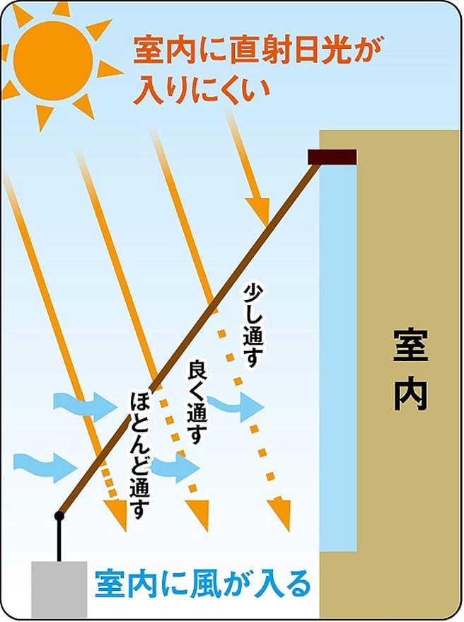 4段階スリット構造の画期的なシェード。日よけ目的部分(上部)の遮光率99.7%、UVカット99.8%。上部で強い日差しをシャットダウンし、下部では風も光も通します。