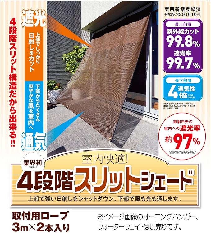 業界初4段階スリット構造。 取付ロープ3m 1本入り。 材質:本体/ポリエチレン・ロープ/面・ハトメ:スチール 中国製