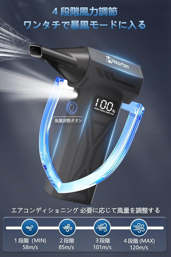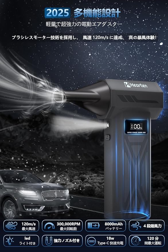 Hearten エアダスター【2025暴風体験・最大風速120m/s】ブロワー 300,000RPM 高速回転 エアダスター 強力 4段階風量調整 ブロワー 強力 8000mAh大容量バッテリー LCD電量表示 電動ぶろわー TPYE-C急速充電 LEDライト付き airダスター 電動 小型ぶろわー 210g 軽量 コンパクト 洗車 ぶろわー PC掃除/キーボード/家具/車内/エアコン(ブラック)