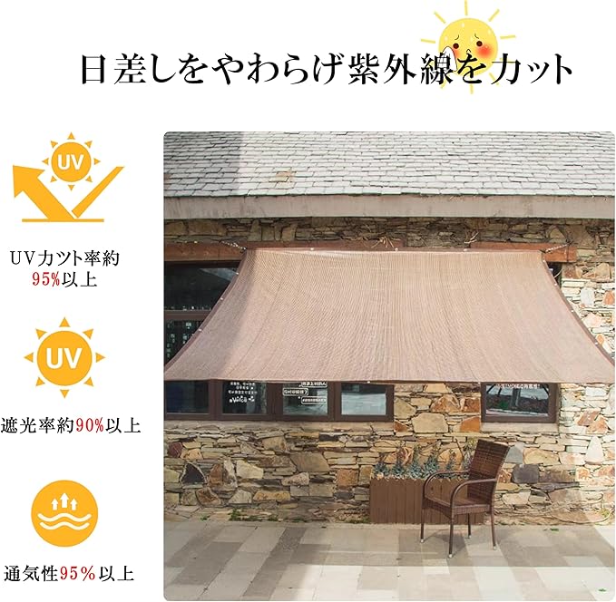 【製品仕様】遮光ネットのサイズ:3m 4m;色:コーヒー色;耐久性に優れた高密度なポリエチレンを使用した日よけシェードです。