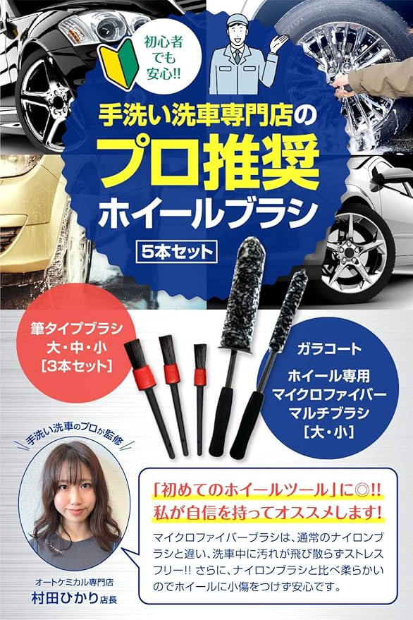 ✅【使いやすさのヒミツ その1】 初心者でも安心!! 手洗い洗車専門店のプロ推奨ホイールブラシ 5本セット 「初めてのホイールツール」に◎!! 私が自信を持ってオススメします! マイクロファイバーブラシは、 通常のナイロンブ ラシと違い、洗車中に汚れが飛び散らずストレスフリー!! さらに、ナイロンブラシと比べ柔らかいのでホイールに小傷をつけず安心です。 ホイールの形状は複雑なため、ボディ用のスポ ンジでは洗いにくいもの。 そこでガラコートのホイール洗浄専用ツール! ホイール専用に設計されているから、複雑な形状のホイールもラクラク洗えます。