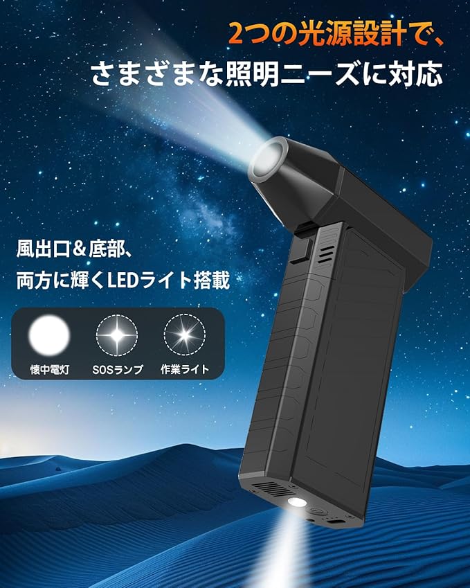 【LEDで暗闇を完全制圧】電動エアーダスター専用作業用ホワイトLEDは「常灯/ストローブ/SOS」3モード切替可能。PCケース内部や車のエンジンルームなど暗所でのエアーブロアー作業を強力サポート。LEDスイッチ1つで直感的に操作可能な多機能設計です。