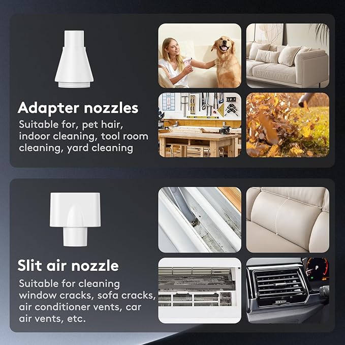 ️【強力に吹き飛ばすエアダスター】強力な電動タイプのエアダスターで、従来の拭き掃除や埃取りのツールに代わる優れたアイテムです。130,000rpmの吹き出し力、最大風速約52m/sで非常に強力!従来の電動エアダスターの約10倍から15倍の威力を誇り、風速や風量が弱いという問題を解決しました。操作がシンプルで、使いやすさも抜群です。落ち葉の掃除はもちろん、砂ぼこりや水、雪を吹き飛ばすのにも便利です。細かい隙間に残った砂や水は、ホウキでは掃ききれないことが多いですが、このブロワーを使えば一瞬で吹き飛ばせます。駐車場のアスファルトの細かい隙間や玄関のタイル、窓のサッシなども効率的に掃除できます。