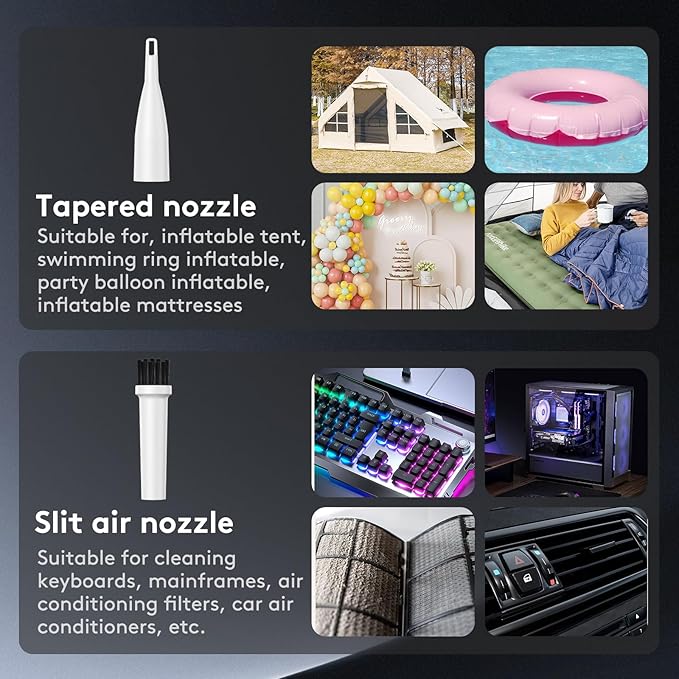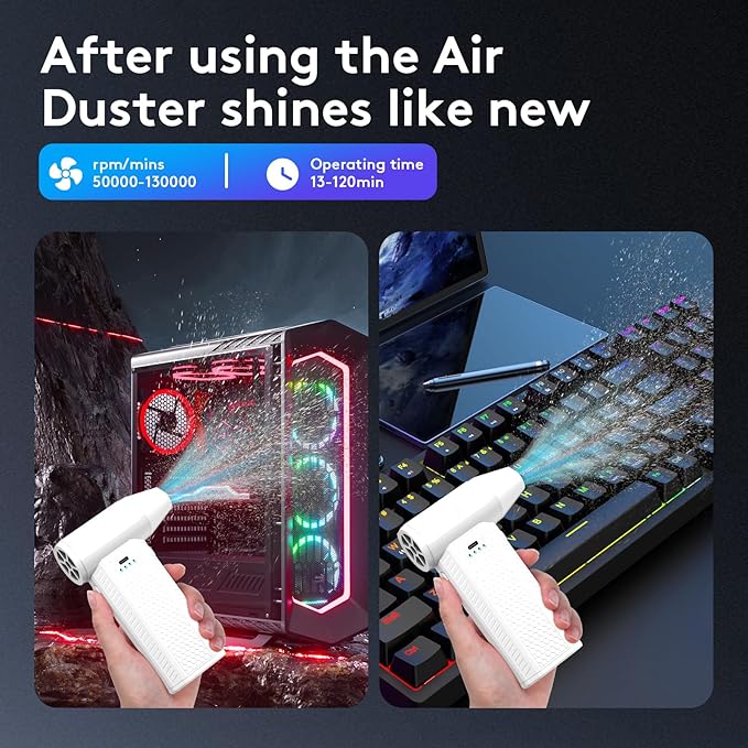【4段階風速調節&簡単操作】このエアダスターは4段階の風速調節機能があり、使用シーンに合わせてお好みの風力に調整できます。ボタン一つで4段階の風速を調節でき、風量は徐々に大きくなったり小さくなったりします。✅風速切り替え方法:➊弱風--風力ボタンを一回クリックすると弱風モードに切り替わります。➋中風--風力ボタンを再度一回クリックすると中風モードに切り替わります。➌強風--風力ボタンをもう一度一回クリックすると強風モードに切り替わります。➍爆風モード--風力ボタンを長押しすると爆風モードが入り、指を離すと爆風モードが切れます。いつでも長押しで爆風モードに入ることができます。