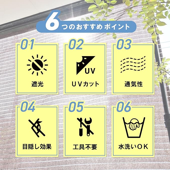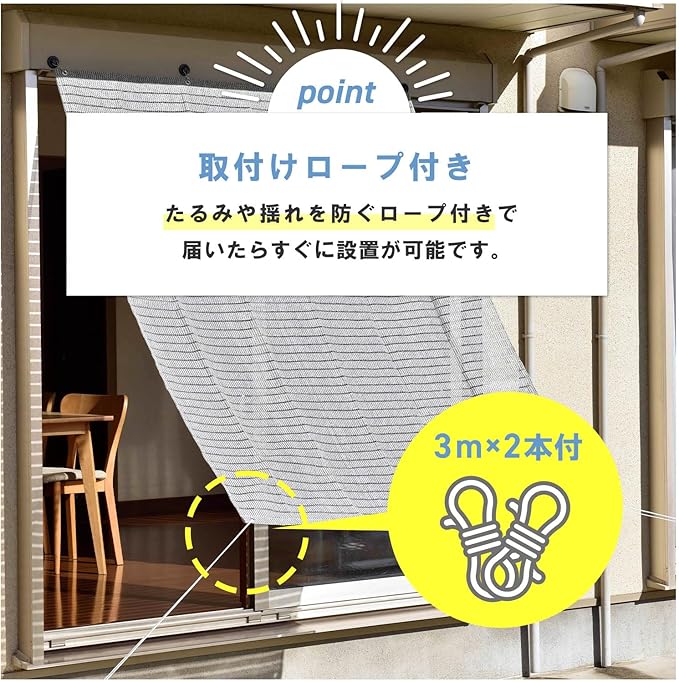 【特徴】日よけや目隠しとして使えるガーデンシェードです。外から入りこんでくる直射日光をやさしく和らげ、室内の温度上昇を緩和し、節電効果も期待できます。水洗いが可能なので汚れた場合も安心です。縦にも横にも使用できるハトメ8個タイプです。