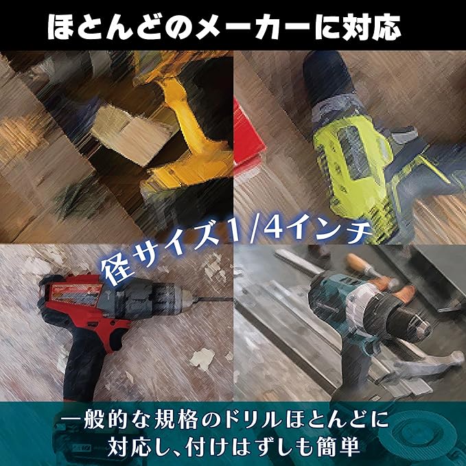 電動ドリルに取り付けて使用できる:こちらのドリルブラシは、電動ドリルに取り付けてご使用いただけます。シャフト径は1/4インチとなっており、ほとんどのメーカーの電動ドリルに取り付けてご使用いただけるので非常に便利です。