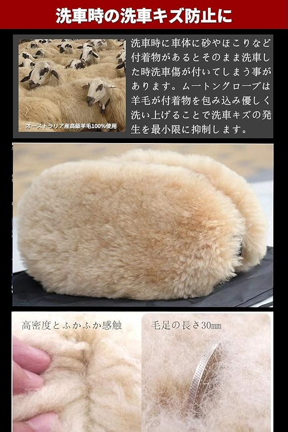 【オーストラリア産羊毛100%】天然羊毛を採用して、ふわふわで、細かい汚れまでしっかりと落とすことができます。洗車による塗装への傷を最小限に抑えることができます。