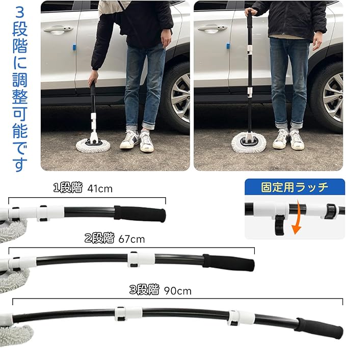 【60~112cm伸縮ハンドル・楽々な洗車体験】洗車モップのハンドルは伸縮可能なデザインで、長さは60cm、85cm、112cmと3段階で調節できます。腰に負担をかけたり衣服や靴を濡らしたりすることなく、車の屋根を掃除できます。また、伸縮部分にロック付きで、洗車する時はハンドルが緩まないように固定できます。