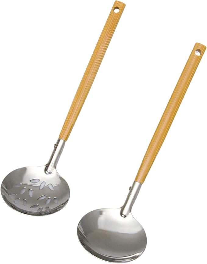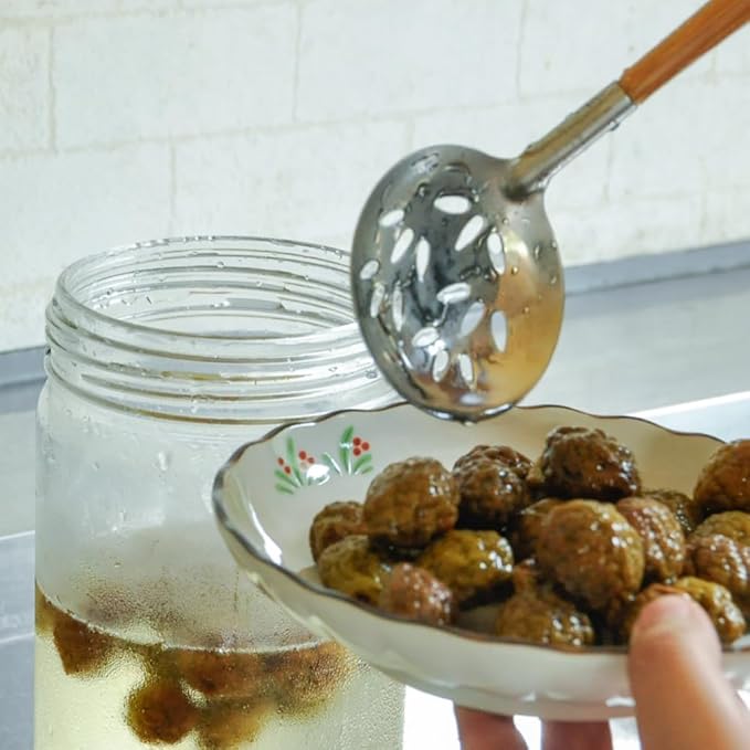具材だけよそいたいときや、シメのスープを残したい鍋に卓上でも使いやすい穴ありお玉と少しだけよそいたいときに便利な浅い穴なしお玉をセットにしました。