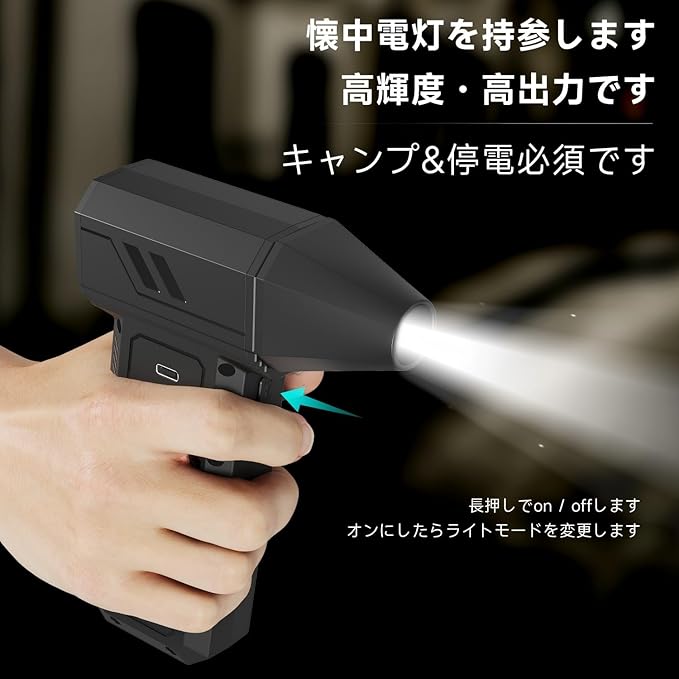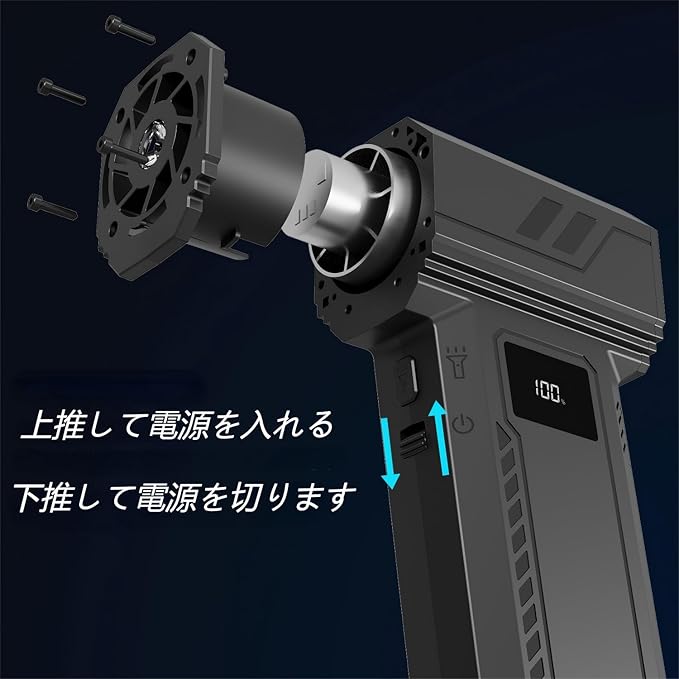 【無段階風量調整】風量は利用シーンに合わせてお好みの強さに調整出来る無段階調整タイプです。使用方法:スライダーを押して風量の微調整(無段階調整)ができます。*ご注意:スライダーを一番下に押し寄せると本体が待機状態に入ります。待機状態で、5分間操作が行わないと自動的に電源オフになります。