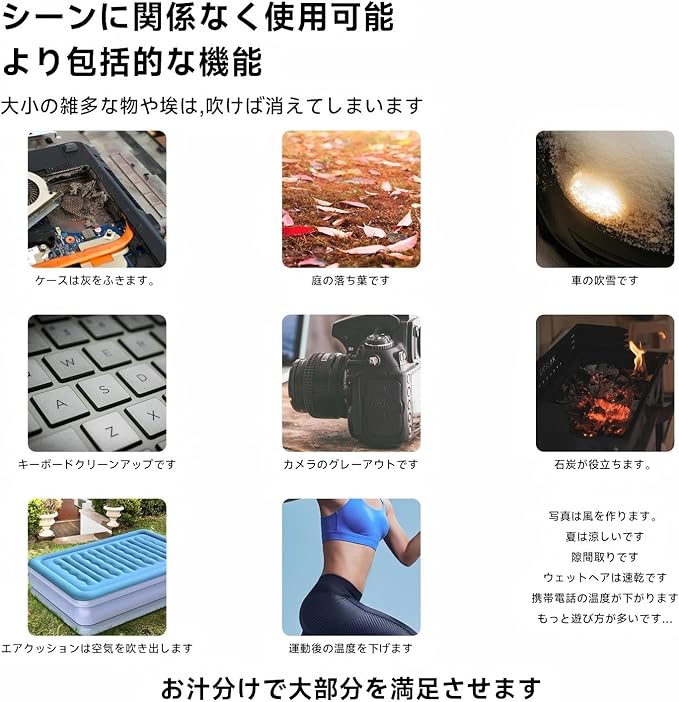 【幅広い用途】 エアダスターはインフレータブル、炭を燃やし、多肉植物からの水滴を吹き飛ば、カーペット、ソファ、カメラ、カー、エアコンの吹出口、窓のシャッター、パソコン、木工用鉋の木屑、プリント回路基板、キーボード掃除などで活躍します。