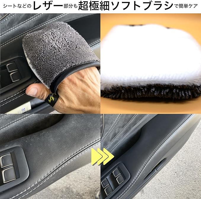 【内装全般の清掃に対応】ハイブリッドミット(レザーシートブラシ)は、超極細ソフトブラシ面がレザーシートに密着し、汚れやほこりを優しく取り除きます。レザーシートだけでなく、布製シートやダッシュボード、ドアパネルなど、車の内装全般の清掃に活用できます。